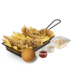 4 تکه استریپس سوخاری شده با ادویه  مخصوص سرزمین سوخاری، 180 گرم سیب زمینی سرخ شده، سالاد کلم، سس سیر، سس کنجد، نان بروتچن